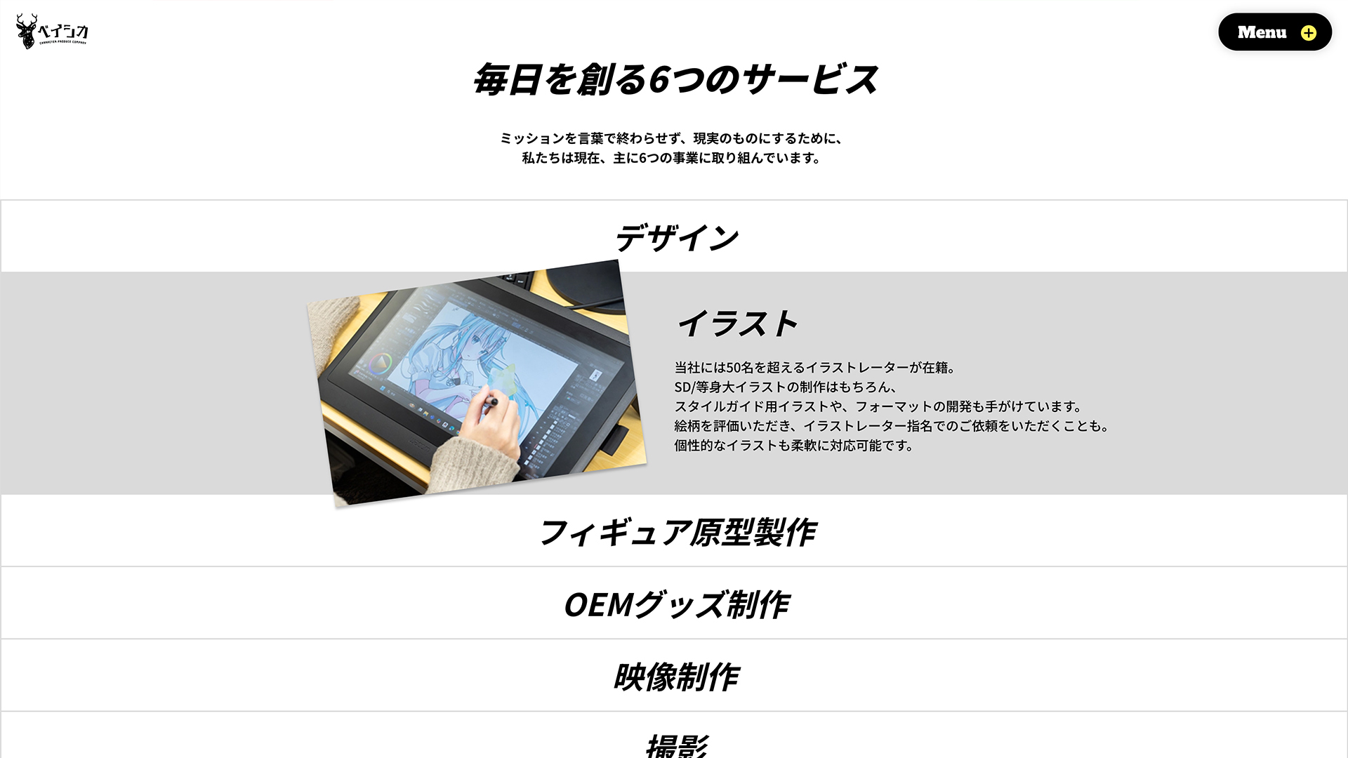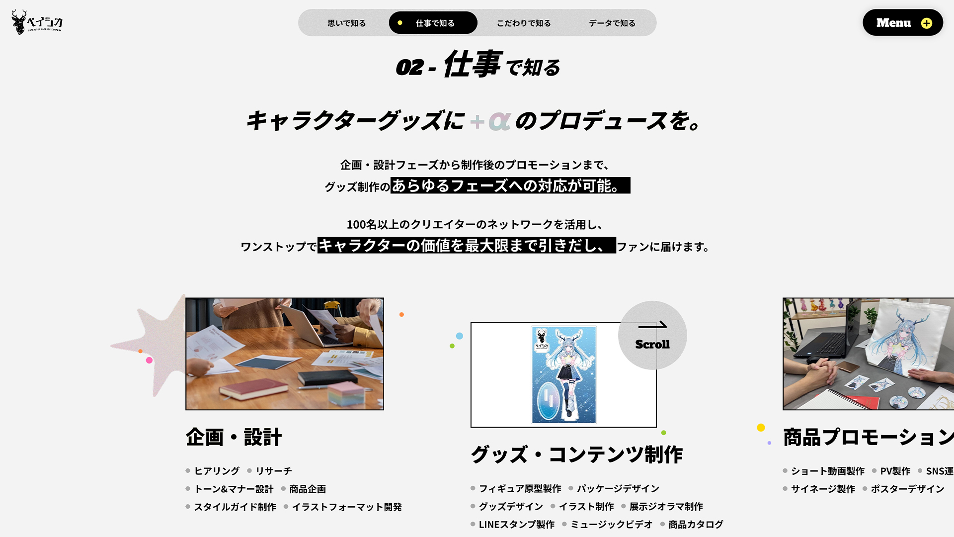 キャラクタープロデュースカンパニー「株式会社BaSICA」- ベイシカ様のコーポレートサイト制作をジュニが担当。ベイシカ様の理念とともに事業内容が体験を持って理解できるようなページに。