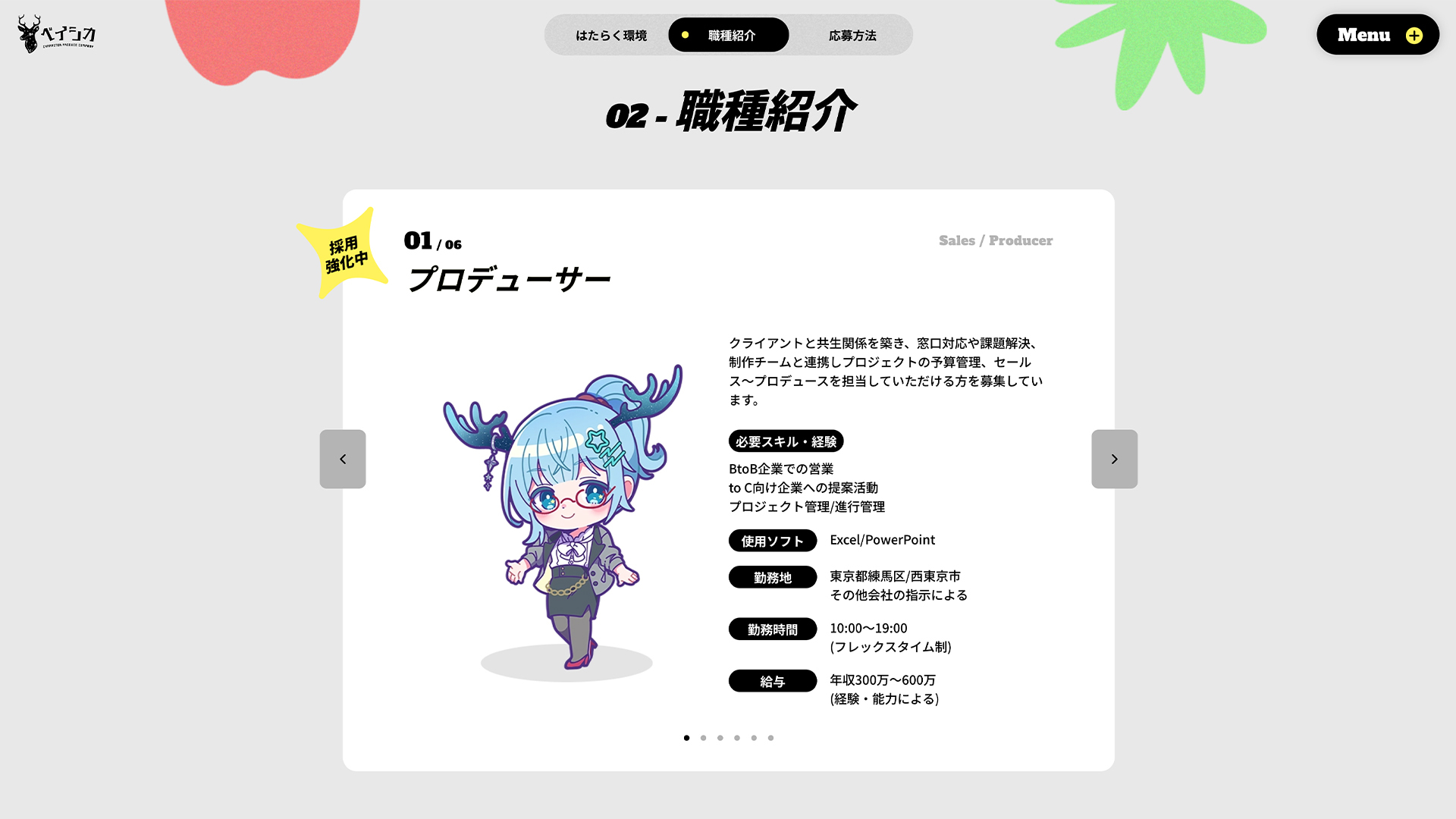 「採用情報」ページでは募集要項をはじめ、選考フローやベネフィットなど、求職者にとって実利的な情報を掲載しています。ここでも職種ごとにSDイラストをベイシカ様に制作いただき、親しみの持てるページになっています。